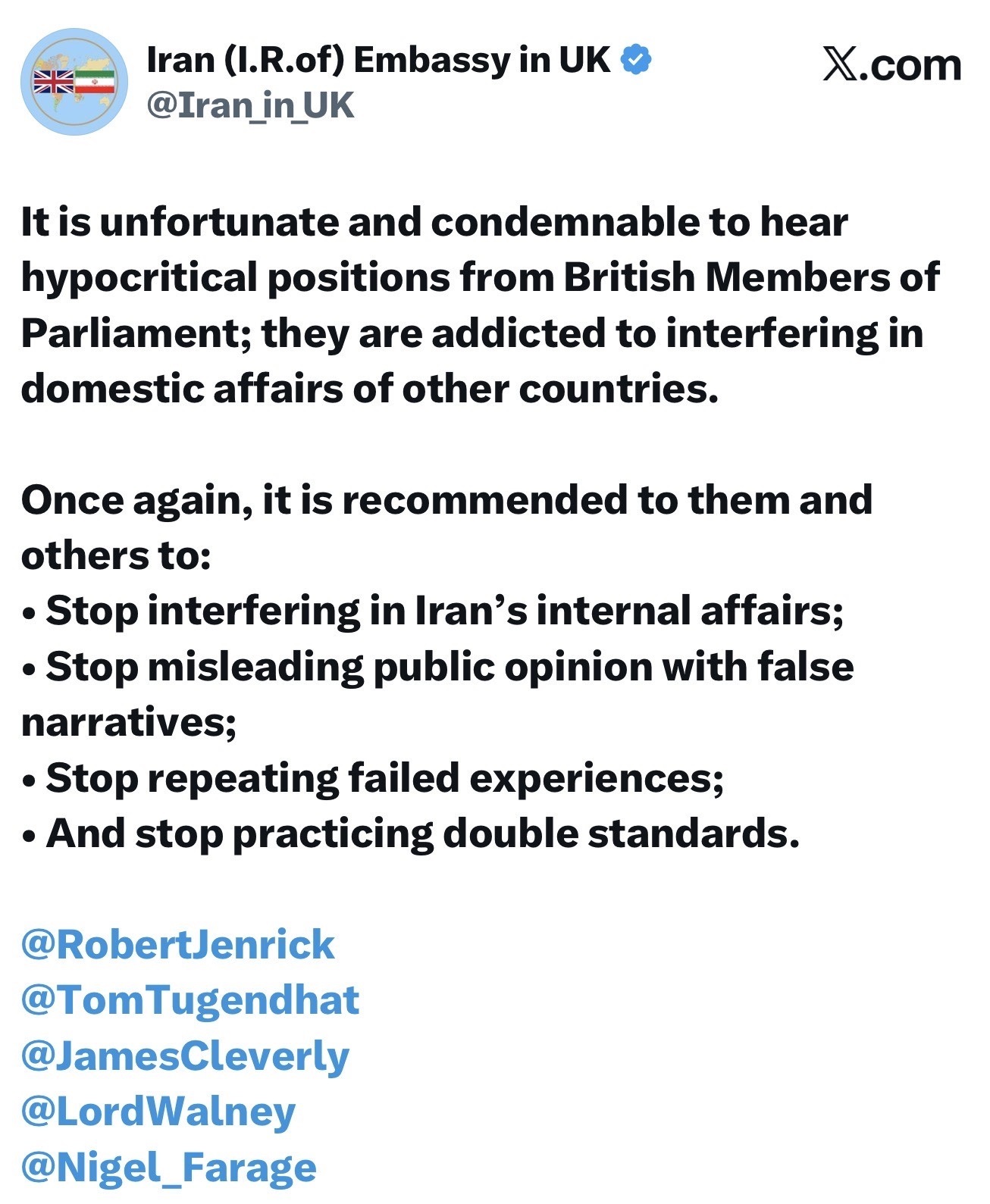 سفارت جمهوری در پاسخ به اظهارات مداخله جویانه نمایندگان پارلمان انگلیس در خصوص اعتراضات ایران در حساب نمایندگی در شبکه X نوشت: