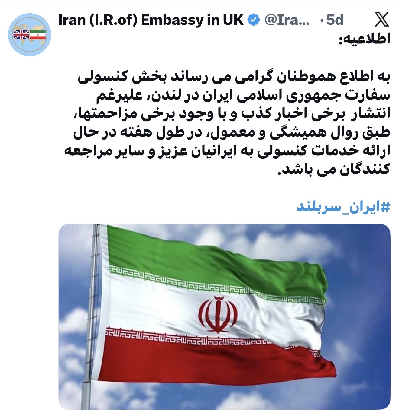 سفارت جمهوری اسلامی ایران در لندن اعلام می دارد علی رغم برخی مزاحمت ها، خدمات کنسولی همچنان، طبق روال عادی به هموطنان عزیز ارائه میگردد.